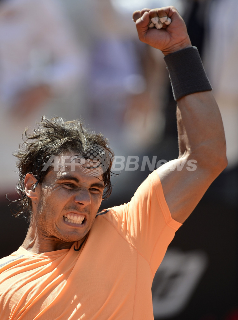 試合に勝利し歓喜するラファエル・ナダル(2012年5月21日撮影)。(c)AFP/FILIPPO MONTEFORTE