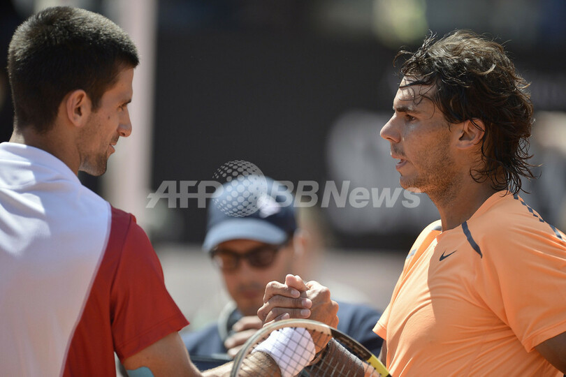 試合後に握手を交わすノバク・ジョコビッチとラファエル・ナダル(2012年5月21日撮影)。(c)AFP/FILIPPO MONTEFORTE