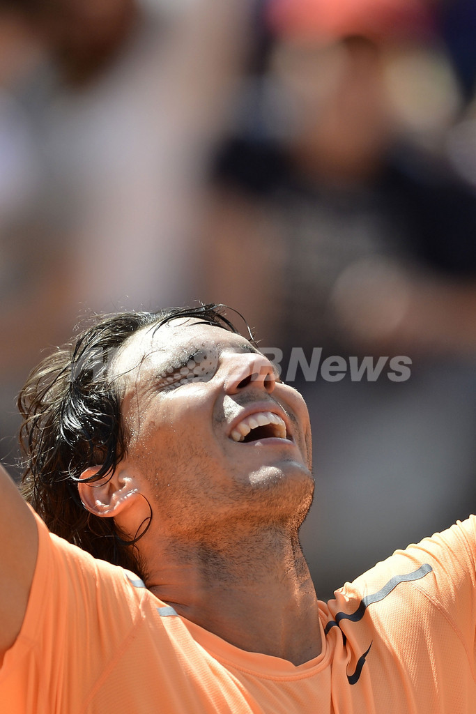 試合に勝利し歓喜するラファエル・ナダル(2012年5月21日撮影)。(c)AFP/FILIPPO MONTEFORTE