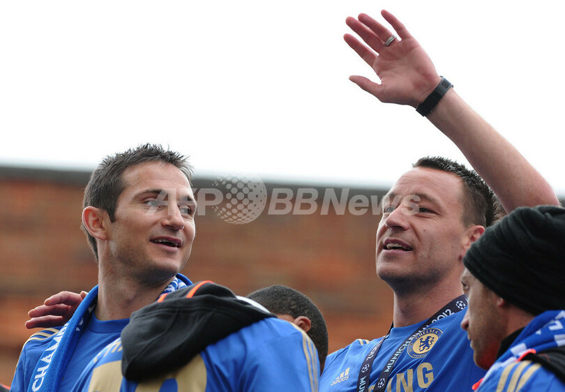 優勝パレードを行うチェルシーのフランク・ランパード(Frank Lampard、左)とジョン・テリー(John Terry、2012年5月19日撮影)。(c)AFP/CARL COURT