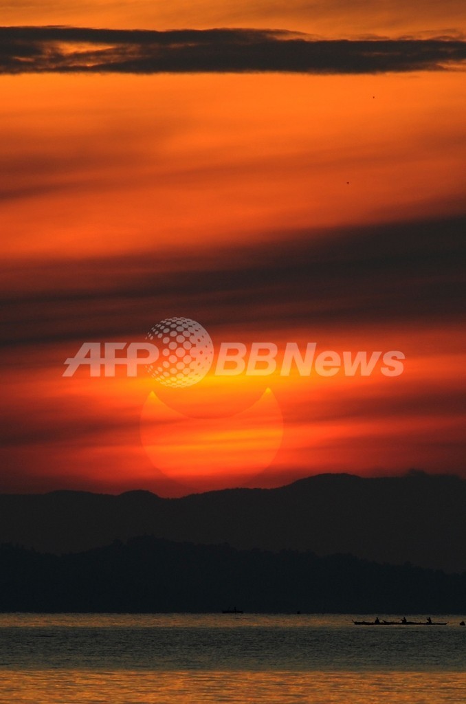 写真は、フィリピンのマニラ(Manila)首都圏ケソン市(Quezon City)のグマカ(Gumaca)で観測された朝日の部分日食(2012年5月21日撮影)。(c)AFP/TED ALJIBE