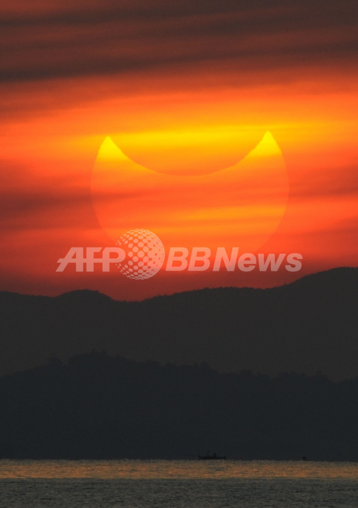写真は、フィリピンのマニラ(Manila)首都圏ケソン市(Quezon City)のグマカ(Gumaca)で観測された朝日の部分日食(2012年5月21日撮影)。(c)AFP/TED ALJIBE