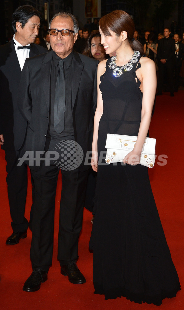 写真は、レッドカーペットに登場した高梨とキアロスタミ監督(2012年5月21日撮影)。(c)AFP/ALBERTO PIZZOLI