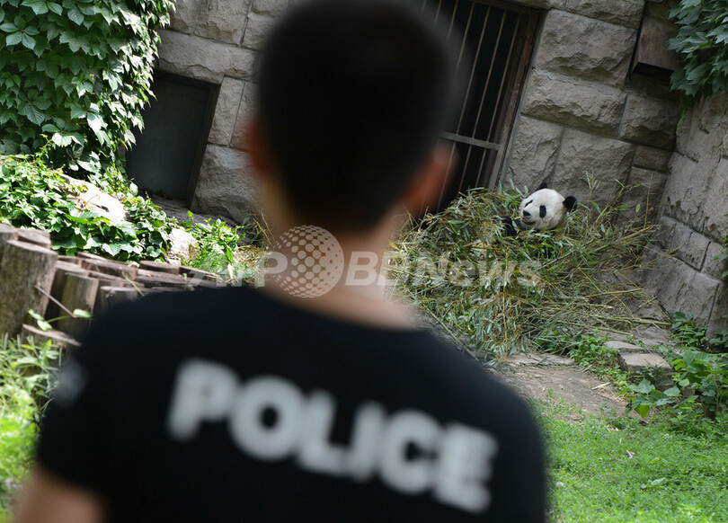 写真は居眠りするパンダを見つめる、「POLICE」と書かれたTシャツを着た男性(2012年5月22日撮影)。(c)AFP/Mark RALSTON