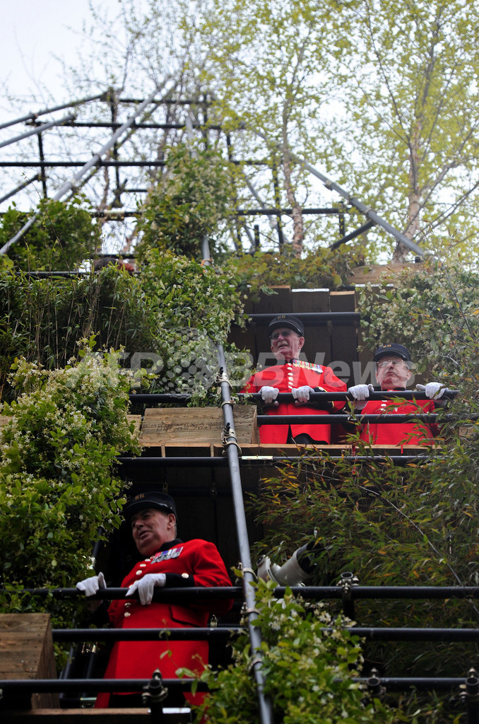 写真は、ピラミッド型に作られた「ウエストランド・マジカル・ガーデン(Westland Magical Garden)」の中でカメラに向かってポーズを取る、チェルシー王立病院の退役軍人ら(2012年5月21日撮影)。(c)AFP/CARL COURT