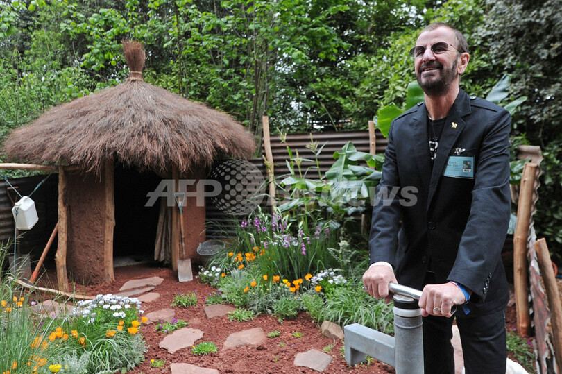 写真は、「Herbert Smith Garden for Wateraid」と題された作品の前でポーズを取る、ビートルズ(The Beatles)の元ドラマー、リンゴ・スター(Ringo Starr)さん(2012年5月21日撮影)。(c)AFP/CARL COURT