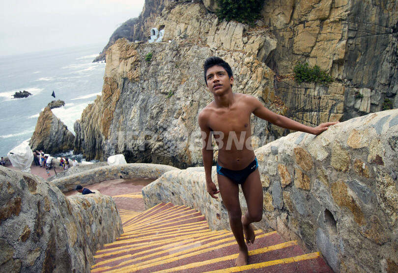 写真は、飛び込みのために崖の上まで続く階段を上る地元の少年(2012年5月17日撮影)。(c)AFP/PEDRO PARDO