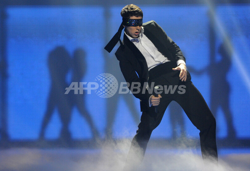 写真は決勝で歌うリトアニア代表の歌手ドンニー・モンテル(Donny Montell、2012年5月27日撮影)。(c)AFP/VYACHESLAV OSELEDKO