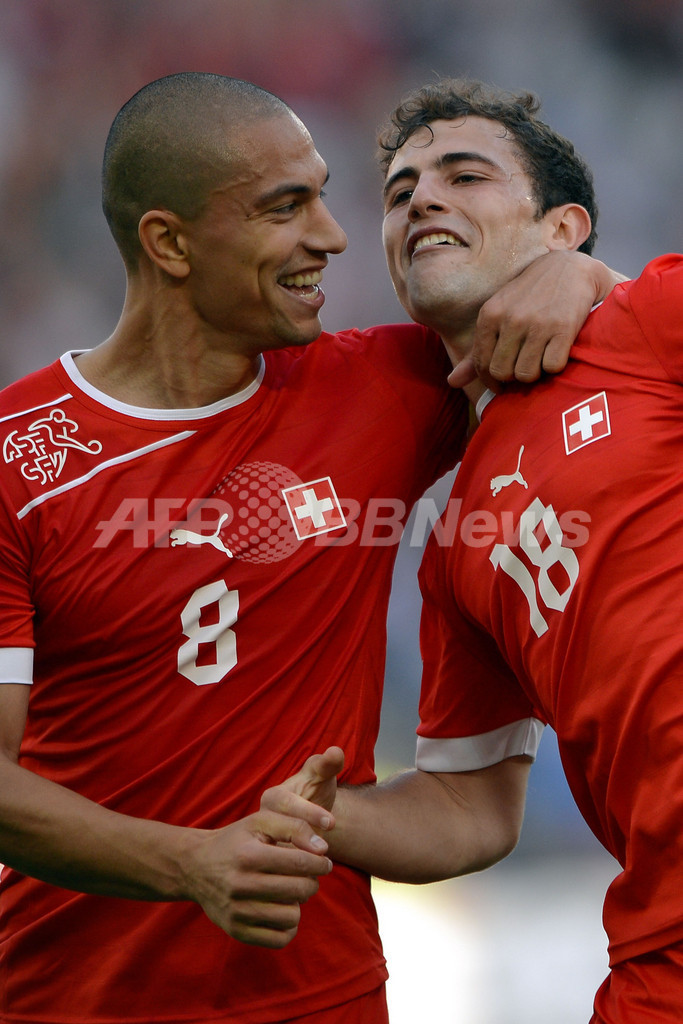 得点を挙げギョクハン・インレル(Gokhan Inler、左)と喜ぶスイスのアドミル・メフメディ(Admir Mehmedi、2012年5月26日撮影)。(c)AFP/FABRICE COFFRINI