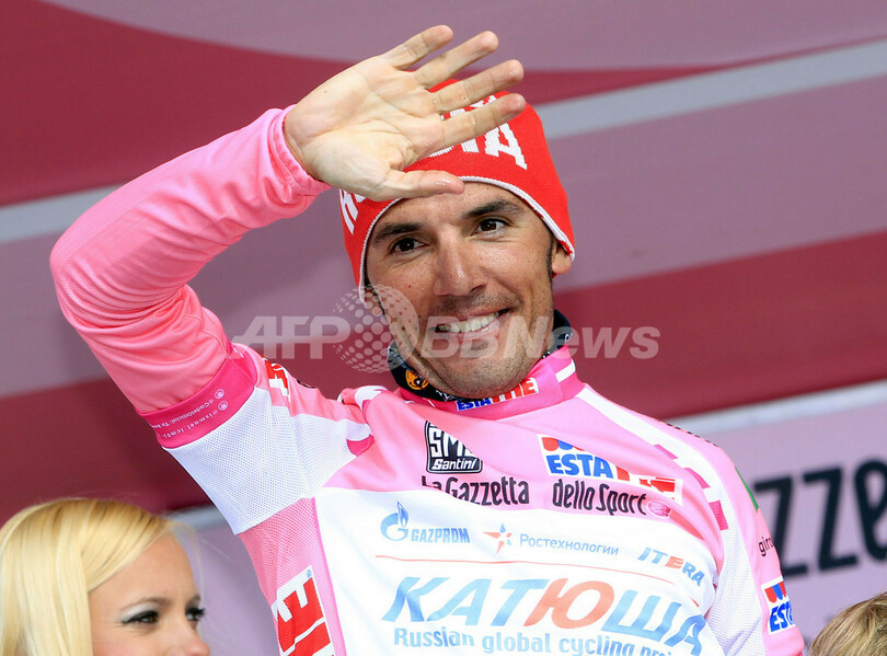 総合首位(マリア・ローザ)を守り、表彰式で笑顔を見せるカチューシャ・チーム(Katusha Team)のホアキン・ロドリゲス(Joaquin Rodriguez、2012年5月26日撮影)。(c)AFP/LUK BENIES