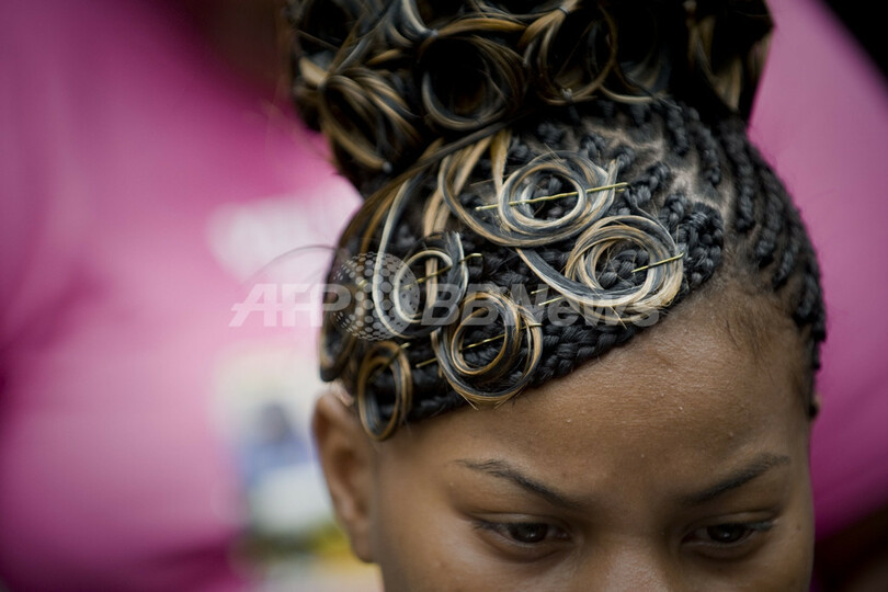 写真は、アフリカ系コロンビア人文化のヘアスタイルを施される女性(2012年5月27日撮影)。(c)AFP/Luis ROBAYO