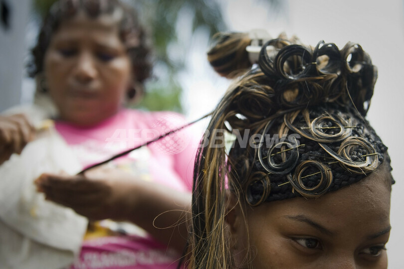 写真は、アフリカ系コロンビア人文化のヘアスタイルを施される女性(2012年5月27日撮影)。(c)AFP/Luis ROBAYO