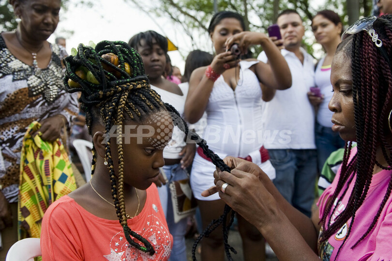 写真は、アフリカ系コロンビア人文化のヘアスタイルを施される女性(2012年5月27日撮影)。(c)AFP/Luis ROBAYO