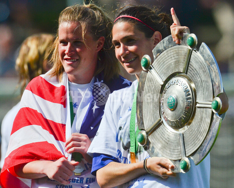 トロフィーを手に優勝を喜ぶトゥルビネ・ポツダムのアリッサ・ニーハー(Alyssa Naeher、左)とアレクサンドラ・シンガー(Alexandra Singer、2012年5月28日撮影)。(c)AFP/PATRICK PLEUL