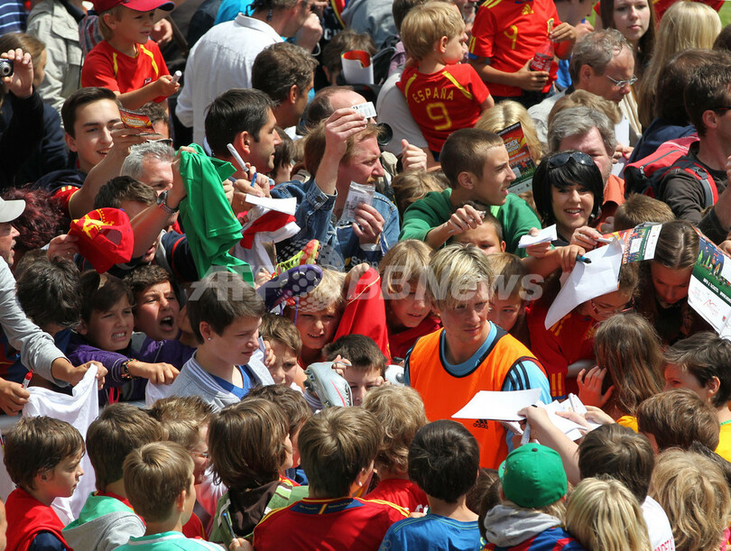練習後にサインを求められるスペイン代表のフェルナンド・トーレス(Fernando Torres、中央、2012年5月28日撮影)。(c)AFP/ALEXANDER KLEIN