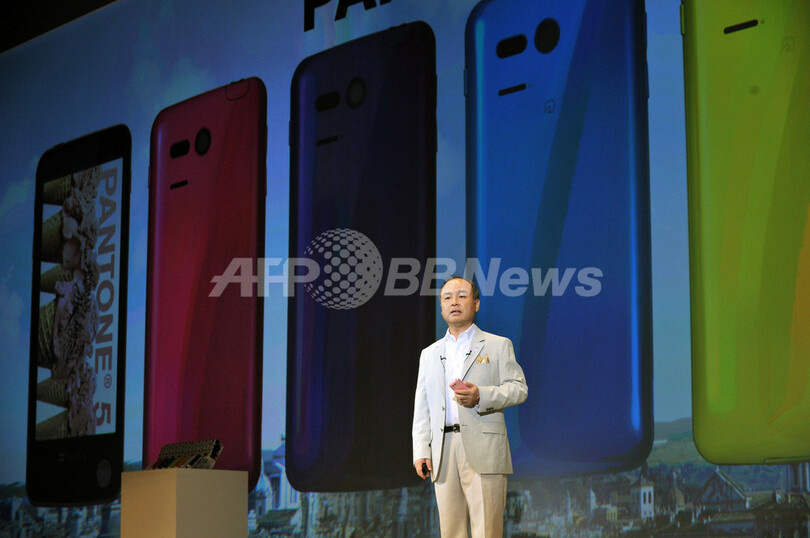 写真は、都内で開催された発表会で「Pantone 5」を紹介する孫正義(Masayoshi Son)社長(2012年5月29日撮影)。(c)AFP/Yoshikazu TSUNO