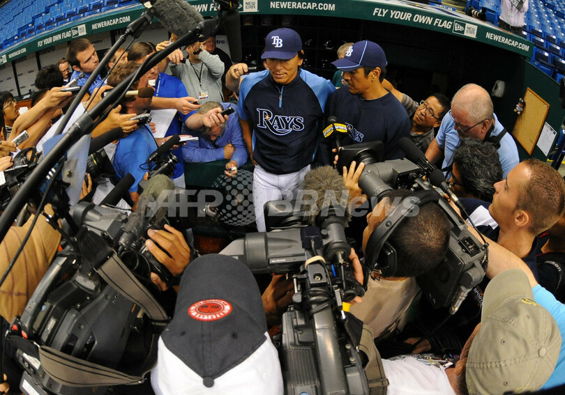 試合前に会見を行うタンパベイ・レイズの松井秀喜(Hideki Matsui、2012年5月29日撮影)。(c)AFP/Getty Images/Al Messerschmidt