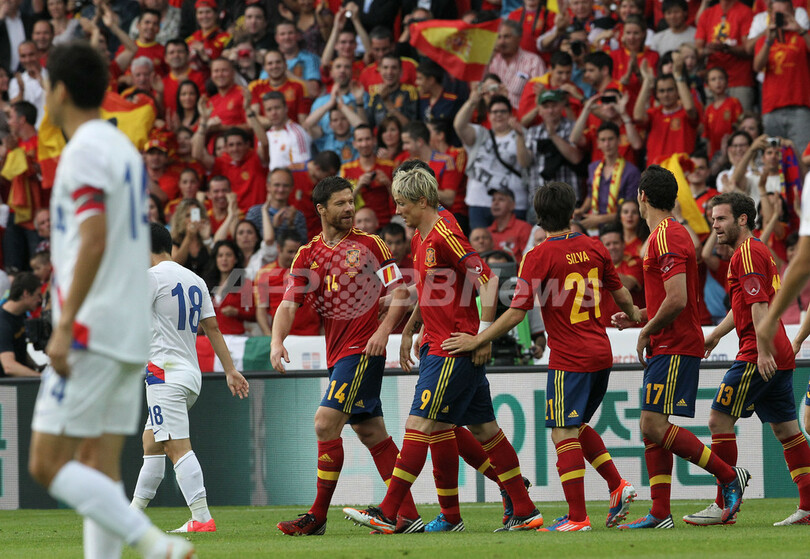 それでもスペインは後半8分にシャビ・アロンソ(Xabi Alonso)のペナルティーキック(PK)で勝ち越すと、その2分後にサンティ・カソルラ(Santi Cazorla)、同35分にアルバロ・ネグレド(Alvaro Negredo)が追加点を挙げ、完勝した。(c)AFP