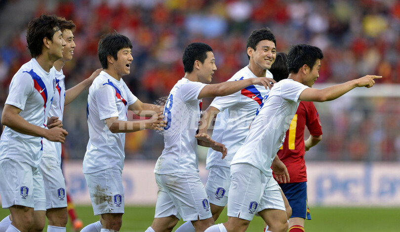 サッカー欧州選手権2012(UEFA Euro 2012)を控える前回大会王者のスペインは、前半12分にフェルナンド・トーレス(Fernando Torres)のゴールで先制したものの、前半終了間際に金斗炫(Kim Do-Heon、キム・ドゥヒョン)に同点ゴールを許した。