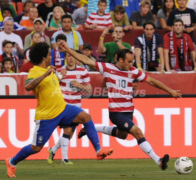 ブラジルのマルセロ(Marcelo Vieira Da Silva Junior、左)を前にキックの体制に入る米国のランドン・ドノバン(Landon Donovan、2012年5月30日撮影)。(c)AFP/Nicholas KAMM