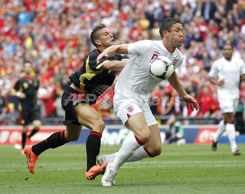 ベルギーのドリース・メルテンス(Dries Mertens、左)に後ろから押され、バランスを崩すイングランドのギャリー・ケイヒル(Gary Cahill、2012年6月2日撮影)。(c)AFP/IAN KINGTON