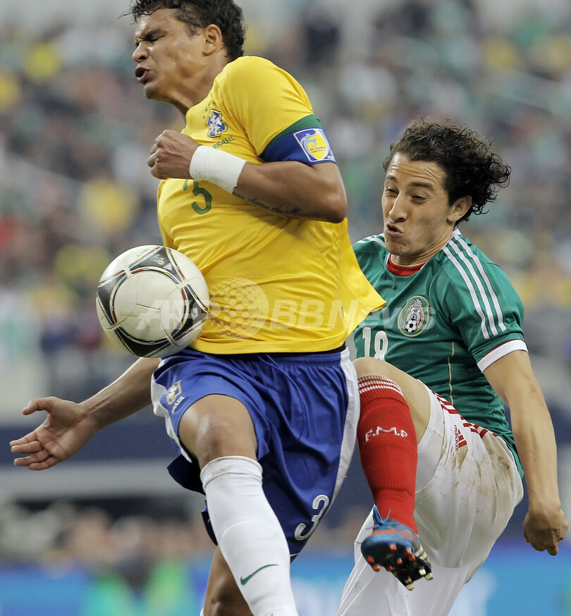 メキシコのアンドレス・グアルダード(Andres Guardado、右)とボールを競るブラジルのチアゴ・シウバ(Thiago Silva、2012年6月3日撮影)。(c)AFP/Getty Images/Brandon Wade