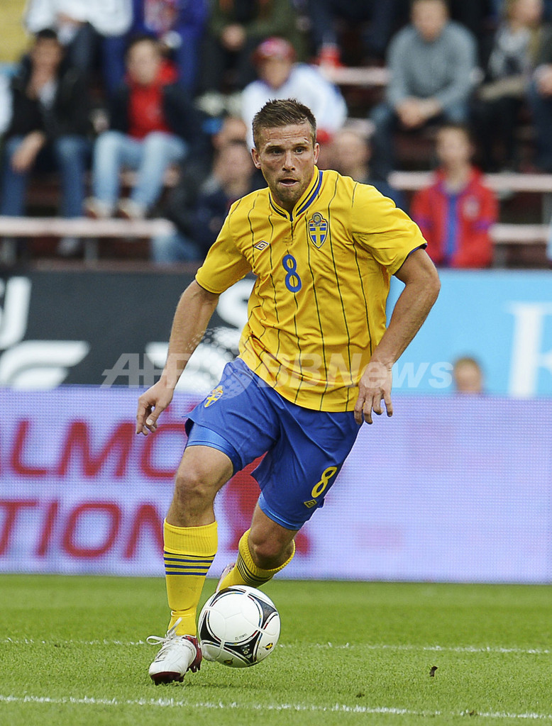 ボールをキープするスウェーデンのアンデルス・スベンソン(Anders Svensson、2012年6月5日撮影)。(c)AFP/JONATHAN NACKSTRAND