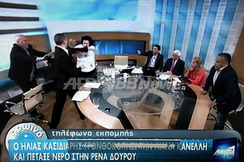 ニュース 政治・経済 ギリシャ極右議員、討論番組の生放送中に暴行 2012年6月8日 11:21 発信地:アテネ/ギリシャ [ ヨーロッパ ギリシャ ] このニュースをシェア ‹ › ❮ 6/6 ❯ ギリシャでテレビの政治討論番組中に左派系政党の女性議員に襲いかかった極右政党「黄金の夜明け」のイリアス・カシディアリス(Ilias Kasidiaris)議員(左から2人目、2012年6月7日撮影)。」(c)AFP/ANTENA 画像作成中 ! 【6月8日 AFP】ギリシャで7日、テレビの政治討論番組の生放送中に極右政党「黄金の夜明け」の男性議員が、出演者の左派政党の女性議員2人に襲いかかり、暴行を加える騒ぎがあった。検察は同日、この男性議員に逮捕状を出した。(c)AFP 政治・経済 一覧へ> メディア・報道関係・法人の方向け 写真・動画 購入のお問合せ>