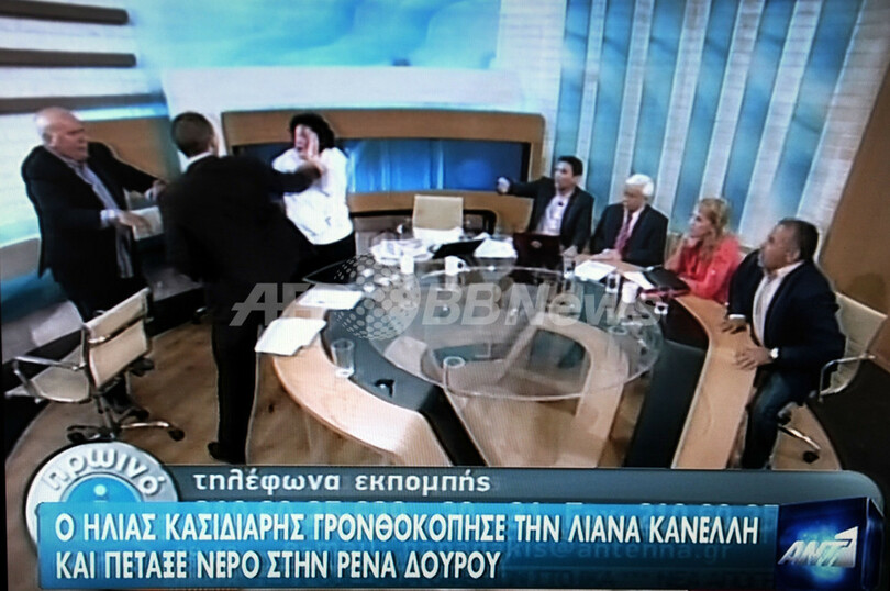 ニュース 政治・経済 ギリシャ極右議員、討論番組の生放送中に暴行 2012年6月8日 11:21 発信地:アテネ/ギリシャ [ ヨーロッパ ギリシャ ] このニュースをシェア ‹ › ❮ 5/6 ❯ ギリシャでテレビの政治討論番組中に左派系政党の女性議員に襲いかかった極右政党「黄金の夜明け」のイリアス・カシディアリス(Ilias Kasidiaris)議員(左から2人目、2012年6月7日撮影)。」(c)AFP/ANTENA 画像作成中 ! 【6月8日 AFP】ギリシャで7日、テレビの政治討論番組の生放送中に極右政党「黄金の夜明け」の男性議員が、出演者の左派政党の女性議員2人に襲いかかり、暴行を加える騒ぎがあった。検察は同日、この男性議員に逮捕状を出した。(c)AFP 政治・経済 一覧へ> メディア・報道関係・法人の方向け 写真・動画 購入のお問合せ>