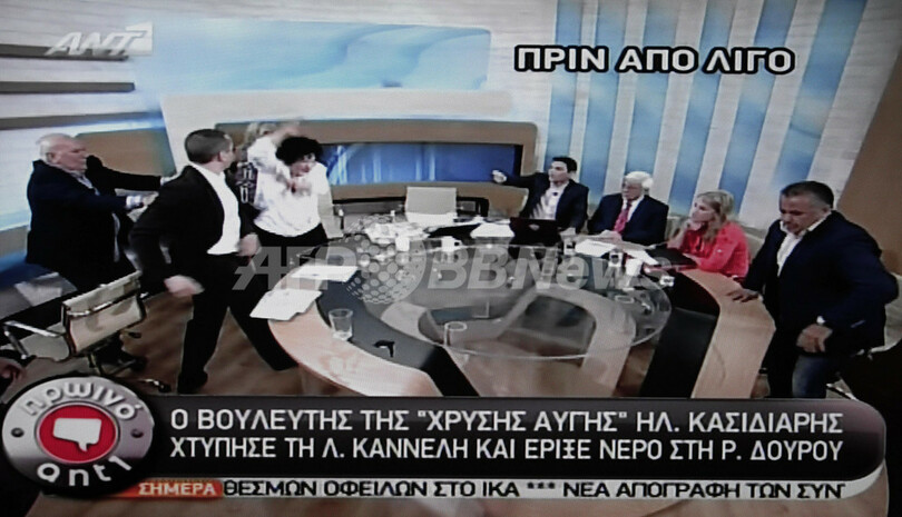ニュース 政治・経済 ギリシャ極右議員、討論番組の生放送中に暴行 2012年6月8日 11:21 発信地:アテネ/ギリシャ [ ヨーロッパ ギリシャ ] このニュースをシェア ‹ › ❮ 2/6 ❯ ギリシャでテレビの政治討論番組中に左派系政党の女性議員に襲いかかった極右政党「黄金の夜明け」のイリアス・カシディアリス(Ilias Kasidiaris)議員(左から2人目、2012年6月7日撮影)。」(c)AFP/ANTENA 画像作成中 ! 【6月8日 AFP】ギリシャで7日、テレビの政治討論番組の生放送中に極右政党「黄金の夜明け」の男性議員が、出演者の左派政党の女性議員2人に襲いかかり、暴行を加える騒ぎがあった。検察は同日、この男性議員に逮捕状を出した。(c)AFP 政治・経済 一覧へ> メディア・報道関係・法人の方向け 写真・動画 購入のお問合せ>