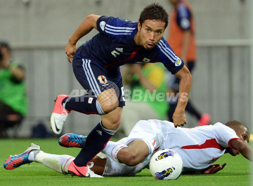 ヨルダンの選手をかわしボールをキープする長友佑都(Yuto Nagatomo、2012年6月8日撮影)。(c)AFP/TOSHIFUMI KITAMURA