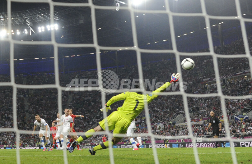 後半37分にロシアのロマン・パフリュチェンコ(Roman Pavlyuchenko)に4失点目を喫すチェコのGKペトル・チェフ(Petr Cech、2012年6月8日撮影)。(c)AFP/ODD ANDERSEN