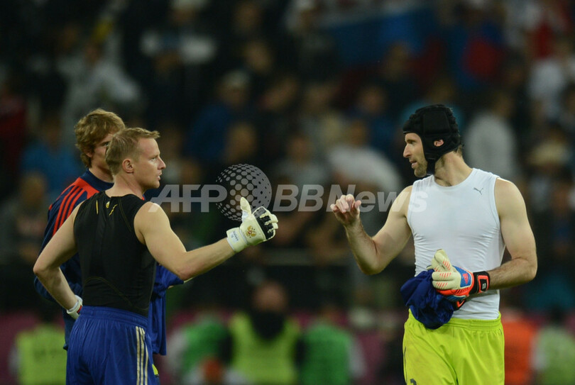 試合後にユニフォームを交換するロシアのGKヴィアチェスラフ・マラフェエフ(Vyacheslav Malafeev)とチェコのGKペトル・チェフ(Petr Cech、2012年6月8日撮影)。(c)AFP/DANIEL MIHAILESCU