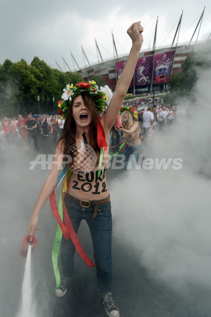 サッカー欧州選手権2012(UEFA Euro 2012)の開幕戦ポーランド対ギリシャ(グループA)が行われたポーランドのワルシャワ国立競技場前で8日、試合開始前にウクライナの女性権利団体「FEMEN」のメンバーがトップレスで売春反対を訴える抗議を行った(2012年6月8日撮影)。(c)AFP/ARIS MESSINIS