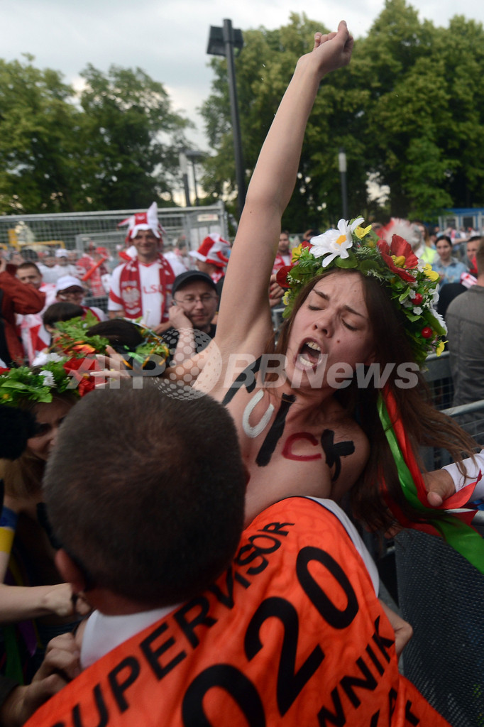 【6月9日 AFP】サッカー欧州選手権2012(UEFA Euro 2012)の開幕戦ポーランド対ギリシャ(グループA)が行われたポーランドのワルシャワ国立競技場前で8日、試合開始前にウクライナの女性権利団体「FEMEN」のメンバーがトップレスで売春反対を訴える抗議を行った。(c)AFP