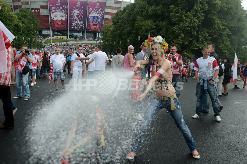 【6月9日 AFP】サッカー欧州選手権2012(UEFA Euro 2012)の開幕戦ポーランド対ギリシャ(グループA)が行われたポーランドのワルシャワ国立競技場前で8日、試合開始前にウクライナの女性権利団体「FEMEN」のメンバーがトップレスで売春反対を訴える抗議を行った。(c)AFP
