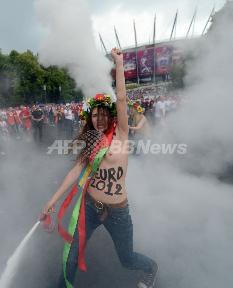 サッカー欧州選手権2012(UEFA Euro 2012)の開幕戦ポーランド対ギリシャ(グループA)が行われたポーランドのワルシャワ国立競技場前で8日、試合開始前にウクライナの女性権利団体「FEMEN」のメンバーがトップレスで売春反対を訴える抗議を行った(2012年6月8日撮影)。(c)AFP/ARIS MESSINIS