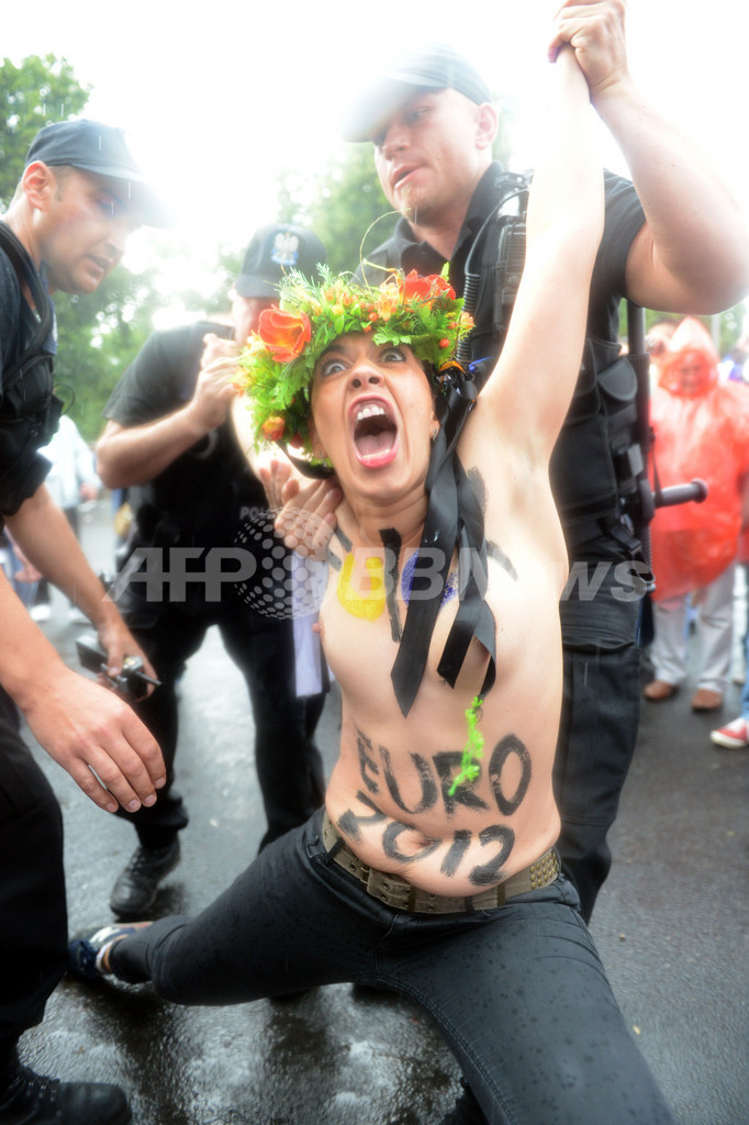 サッカー欧州選手権2012(UEFA Euro 2012)の開幕戦ポーランド対ギリシャ(グループA)が行われたポーランドのワルシャワ国立競技場前で8日、試合開始前にウクライナの女性権利団体「FEMEN」のメンバーがトップレスで売春反対を訴える抗議を行った。写真は、警察官に取り押さえられるメンバー(2012年6月8日撮影)。(c)AFP/JANEK SKARZYNSKI