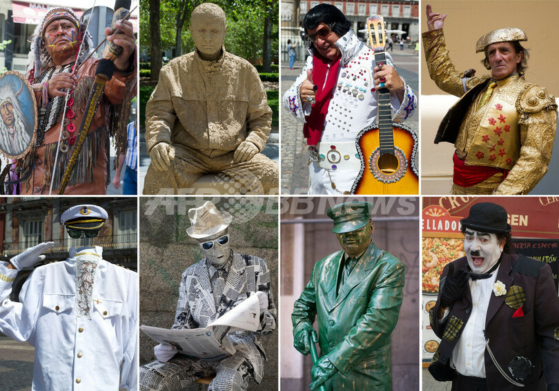 写真はマドリードの広場プエルタ・デル・ソル(Puerta del Sol)近くで彫像に扮する人々。左上から右回りに、米先住民族アパッチ(Apache)、砂男、エルビス・プレスリー(Elvis Presley)、闘牛士、チャーリー・チャップリン(Charlie Chaplin)、掃除夫の銅像、新聞男、透明人間の「生ける彫像」(2012年6月6日撮影)。(c)AFP/DOMINIQUE FAGET