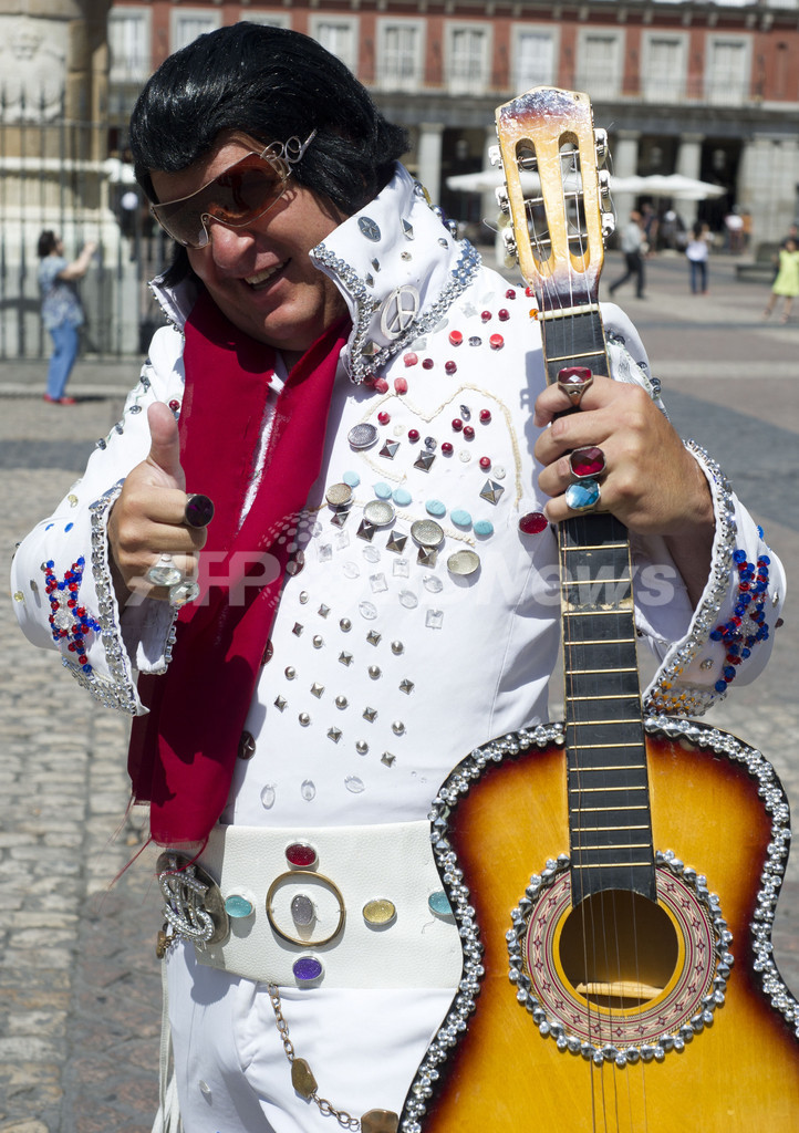 写真はマドリードの広場プエルタ・デル・ソル(Puerta del Sol)近くで、エルビス・プレスリー(Elvis Presley)の像に扮した人(2012年6月6日撮影)。(c)AFP/DOMINIQUE FAGET