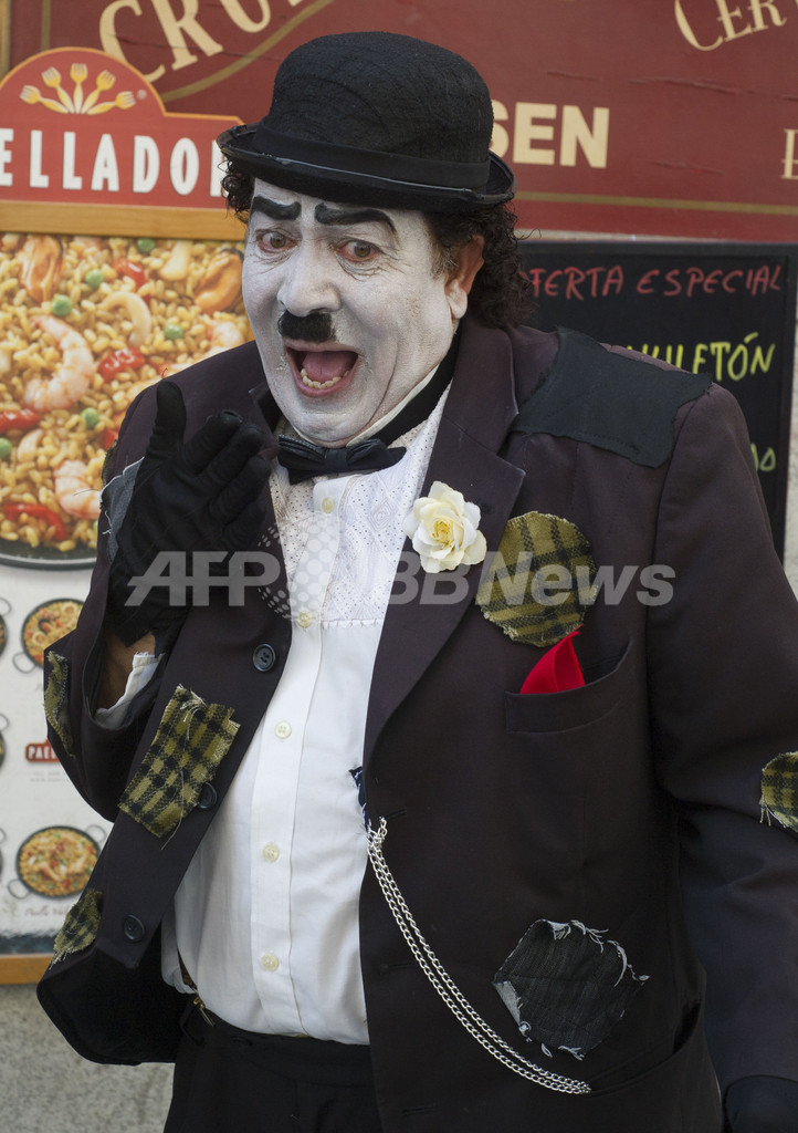 写真はマドリードの広場プエルタ・デル・ソル(Puerta del Sol)近くで、喜劇王チャーリー・チャップリン(Charlie Chaplin)の像に扮した人(2012年6月6日撮影)。(c)AFP/DOMINIQUE FAGET