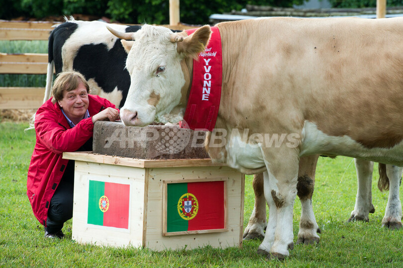 ところが、南部デッゲンドルフ(Deggendorf)近郊の動物保護飼育園Gut Aiderbichlでは、ウシの「イボンヌ(Yvonne)」が同じく国旗のついた餌箱を使った占いで、ポルトガル勝利を「予言」。相反する結果が出た。(c)AFP