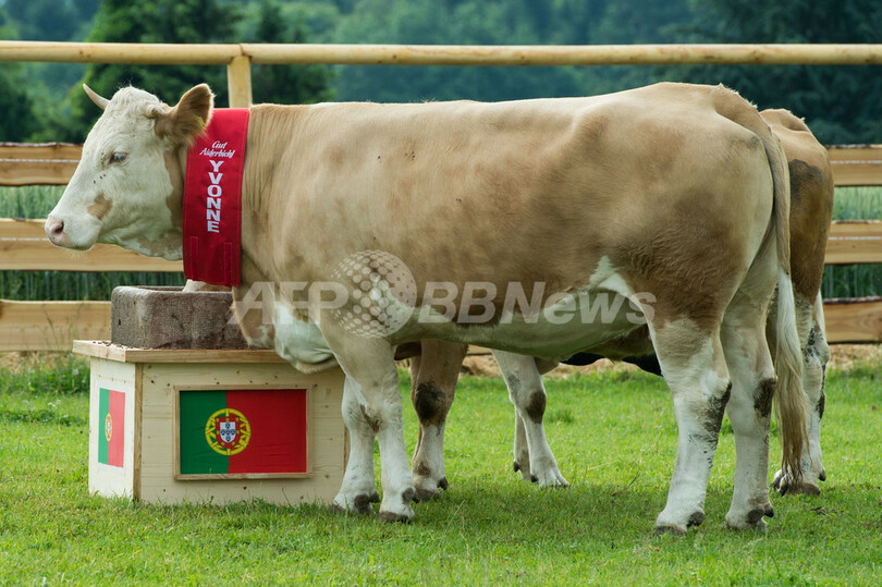 ところが、南部デッゲンドルフ(Deggendorf)近郊の動物保護飼育園Gut Aiderbichlでは、ウシの「イボンヌ(Yvonne)」が同じく国旗のついた餌箱を使った占いで、ポルトガル勝利を「予言」。相反する結果が出た。(c)AFP