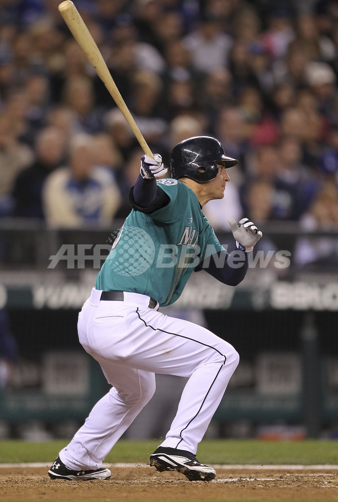 7回に先制適時打を放ったシアトル・マリナーズのカイル・シーガー(Kyle Seager、2012年6月8日撮影)。(c)AFP/Getty Images/Otto Greule Jr