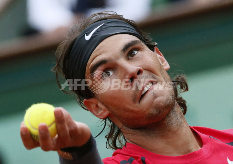 サーブトスを上げるラファエル・ナダル(2012年6月10日撮影)。(c)AFP/PATRICK KOVARIK