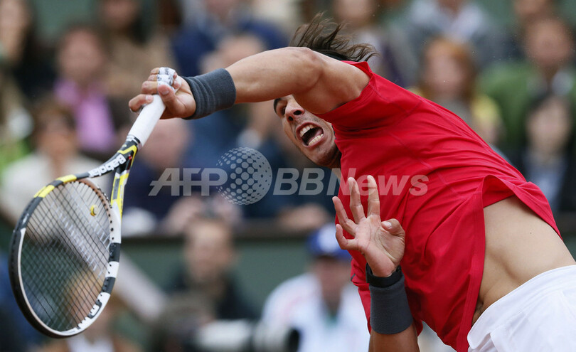 サーブを放つラファエル・ナダル(2012年6月10日撮影)。(c)AFP/PATRICK KOVARIK