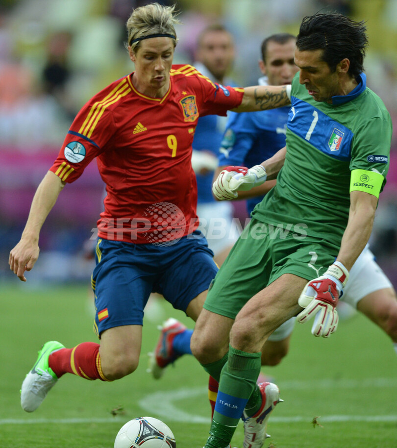 その後、デル・ボスケ監督はセスクに代えてストライカーのフェルナンド・トーレス(Fernando Torres)を投入するも、トーレスはイタリアのゴールキーパー(GK)ジャンルイジ・ブッフォン(Gianluigi Buffon)と1対1になるなど決定的なチャンスを2度も得ながらゴールすることはできず、試合は引き分けで終了した。(c)AFP/Barnaby Chesterman