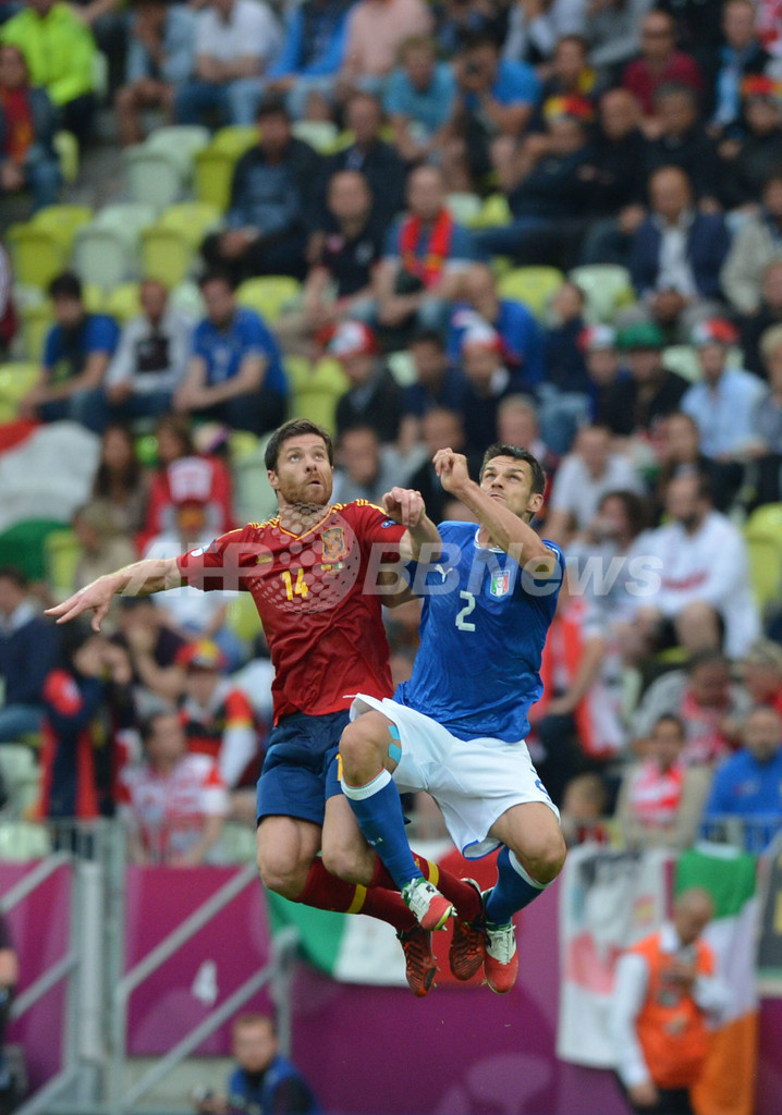 スペインのシャビ・アロンソ(Xabi Alonso、左)とボールを競るイタリアのクリスティアン・マッジョ(Christian Maggio、2012年6月10日撮影)。(c)AFP/GABRIEL BOUYS