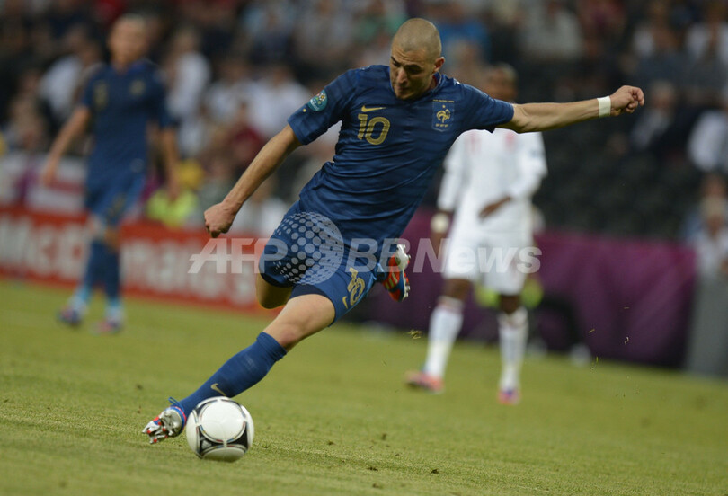 シュートを狙うフランスのカリム・ベンゼマ(Karim Benzema(2012年6月11日撮影)。(c)AFP/FILIPPO MONTEFORTE