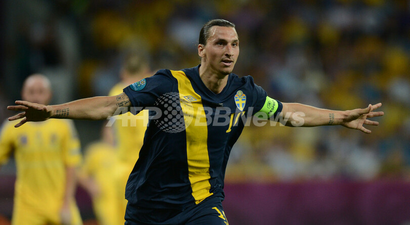 後半7分に先制ゴールを決め歓喜するスウェーデンのズラタン・イブラヒモビッチ(Zlatan Ibrahimovic、2012年6月11日撮影)。(c)AFP/JEFF PACHOUD